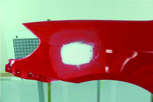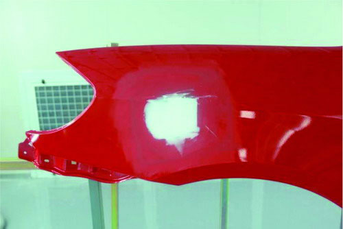 ②指刮法。在原子灰干燥過程中,可以用手指甲輕輕地刮原子灰邊緣薄的部分,檢查原子灰是否已經(jīng)干透。如果沒有干透,則在指甲上會粘有原子灰;如果已經(jīng)干透,則指甲不會粘上原子灰,并在原子灰上出現(xiàn)堅(jiān)硬的白色痕跡。如圖2-53所示。