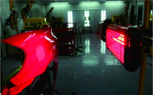 ②紅外線干燥。如果環(huán)境溫度太低或者空氣濕度太大,原子灰干燥固化速度就會減慢。為了縮短原子灰的干燥時(shí)間,可以借用干燥器或者是紅外線烤燈加熱原子灰進(jìn)行干燥。一般烘烤時(shí)間設(shè)定為10min左右,在烘烤過程中,要不斷檢測板件的溫度,并檢查原子灰是否已經(jīng)干燥。如圖2-51所示。