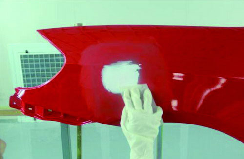 在進(jìn)行原子灰刮涂之前,應(yīng)先對已經(jīng)刷涂好的底漆部分進(jìn)行必要的打磨及清潔。先使用菜瓜布對底漆部分進(jìn)行輕微打磨,可以去掉底漆多余的那部分漆粉。再用吹塵槍進(jìn)行除塵清潔,避免刮涂后的原子灰與底漆結(jié)合不牢固。如圖2-31所示。