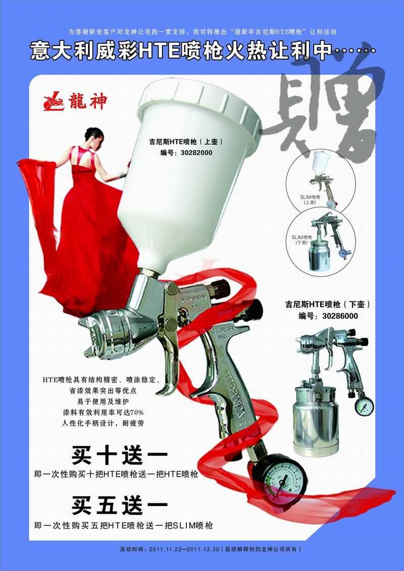 吉尼斯HTE噴槍11月促銷 吉尼斯HTE噴槍2011年11月促銷 (活動已結束,感謝您的關注) 一、主題: 吉尼斯HTE噴槍讓利促銷 二、活動目的: 讓利回饋給力促銷 三、活動時間: 1、 時間:2011年11月21日至2011年12月30日 2、 時長:共計40天 四、活動內容: 1、 買十送一(即一次購買十把HTE噴槍送一把HTE噴槍) 2、 買五送一(即一次購買五把HTE噴槍送一把SLIM噴槍) 市場部 2011年11月17日 宣傳海報 2011-11-19 12776