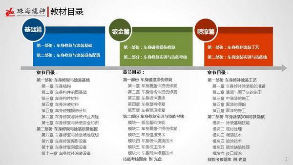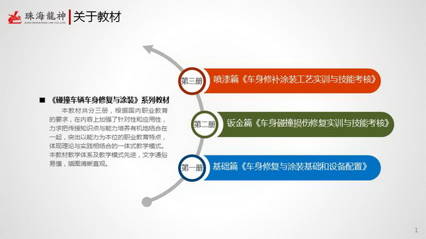 珠海市龍神有限公司2014年隆重巨獻《碰撞車輛車身修復與涂裝》系列教材:基礎篇《車身修復與涂裝基礎和設備配置》、鈑金篇《車身碰撞損傷修復實訓與技能考核》、噴漆篇《車身修補涂裝工藝實訓與技能考核》。