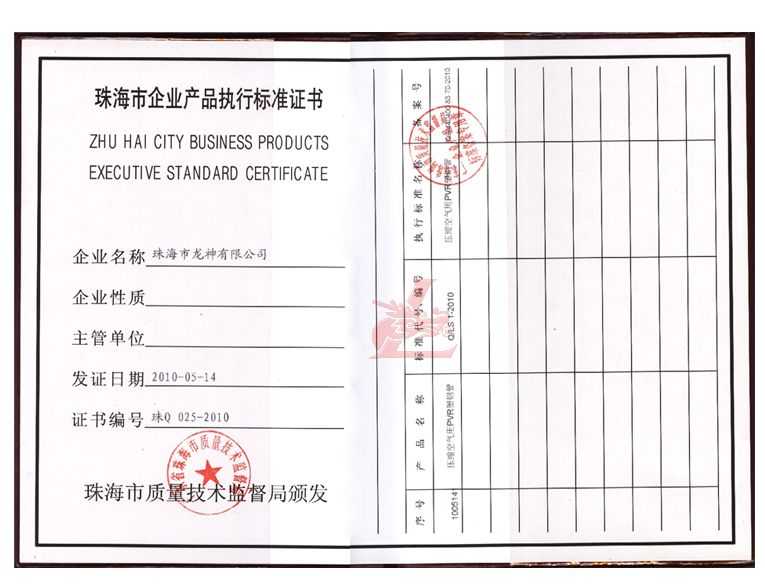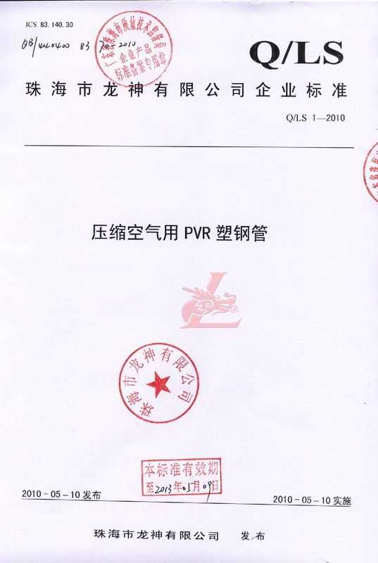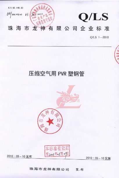 龍神壓縮空氣PVR塑鋼管成功申請企業執行標準 2010年5月珠海市龍神有限公司“壓縮空氣PVR塑鋼管”得到珠海市質量技術監督局認可,特此頒發“壓縮空氣PVR塑鋼管企業執行標準”,龍神公司在嚴格執行標準下,保證產品質量。 2010-05-20 9871