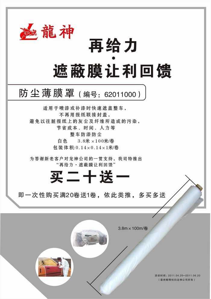2011年4月再給力·遮蔽膜讓利回饋促銷! 2011年4月再給力·遮蔽膜讓利回饋促銷! (活動已結束,感謝您的關注) 一、活動主題: “再給力,遮蔽膜讓利回饋” 二、活動時間: 1、時間:2011年04月20日至2011年06月20日 2、時長:共計2個月 三、促銷產品: 防塵薄膜罩 尺寸3.8米*100米/卷 龍神編號:62011000 買20送1 ,一次性購買滿20卷送1卷,如此類推,多買多送。 2011-04-19 12277