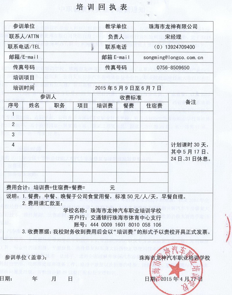 培訓(xùn)時(shí)間30天,即從2015年5月9日起至6月7日止,其中5月17日、24日31日休息;期間餐費(fèi)按照上課時(shí)間27天預(yù)收,實(shí)際參照離開時(shí)間調(diào)整。具體收費(fèi)情況請(qǐng)來(lái)電咨詢。