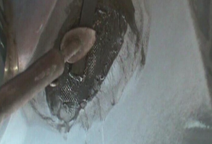 步驟8:使用專用烙鐵將玻纖膠條從無銹加固網的周圍慢慢向洞孔中心覆蓋,如圖1-8所示。