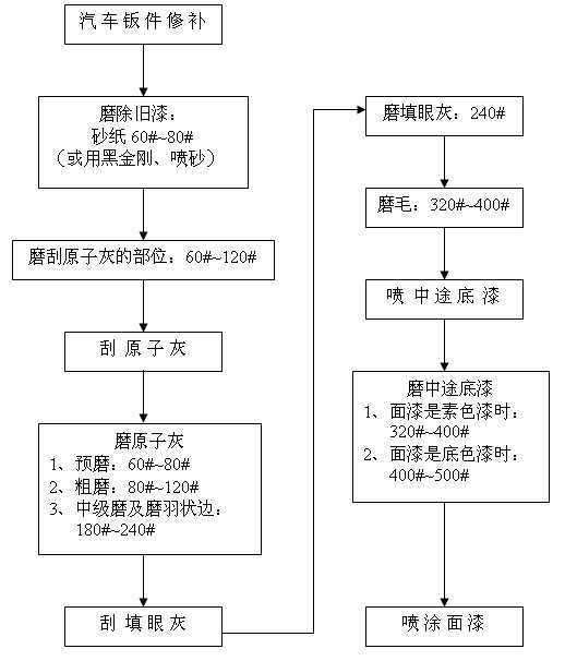 汽車修補干磨程序及砂紙的選擇 備注: 1、除舊漆時采用黑金剛配除漆除銹機能夠快速地除去平面、狹縫及凹凸不平表面的舊漆與銹漬;采用噴砂槍噴砂還可以很快地去除某些孔隙、縫隙或手都很難伸進去的部位的舊漆與銹斑; 2、在磨填眼灰、中途底漆和尤其有邊角位、弧度位的表面時配打磨緩沖墊(置于圓盤砂紙和托盤之間)能夠使打磨作業更加順暢,并能獲得規則的表面質量。 2007-08-25 12272