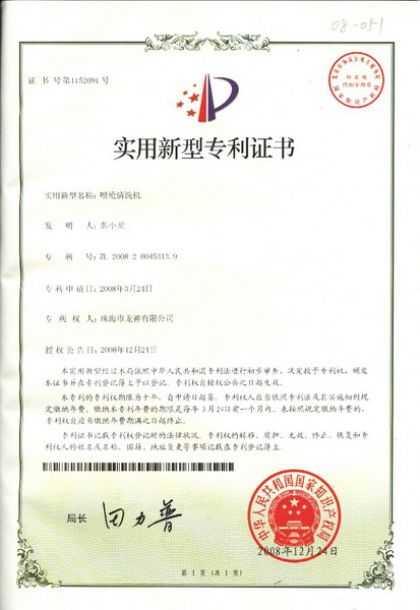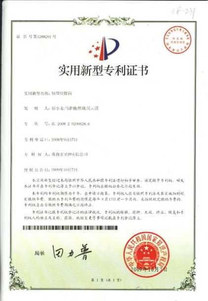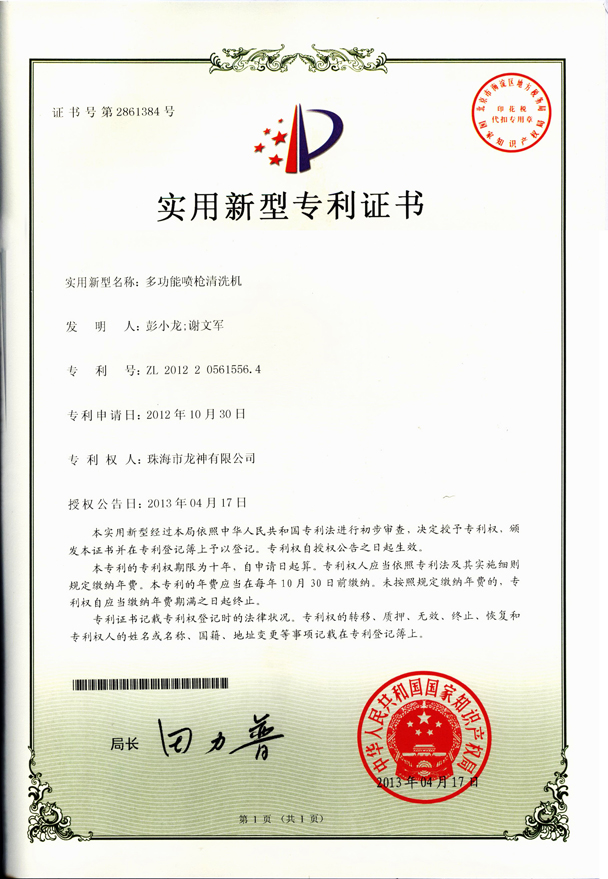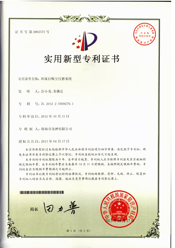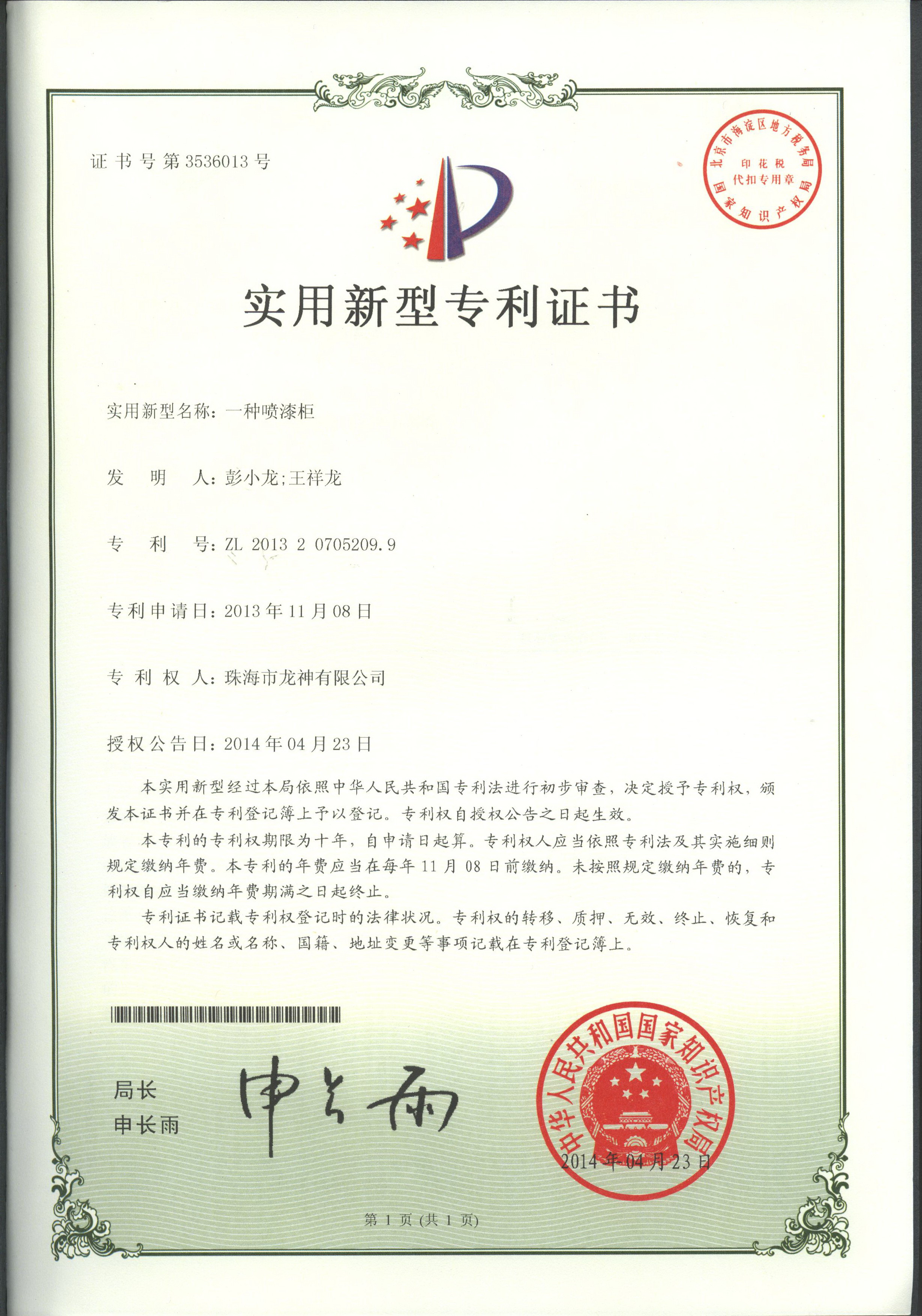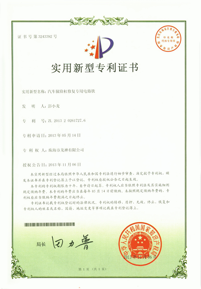 企業榮譽 調漆裝置專利證書 噴漆柜專利證書遮蔽紙切紙架專利證書 塊型拉拔鉤專利證書 噴槍清洗機專利證書無靜電干燥加熱器專利證書 壓縮空氣空壓機房供應系統專利證書除油劑導料器專利證書多功能噴槍清洗機 環保自吸塵打磨系統 切膜裝置汽車保險杠修復專用電烙鐵 精確可調整形架專利證書 移動式無塵干磨專利證書 管道快速連接件專利證書 彭小龍總經理證書 2012-11-27 30923