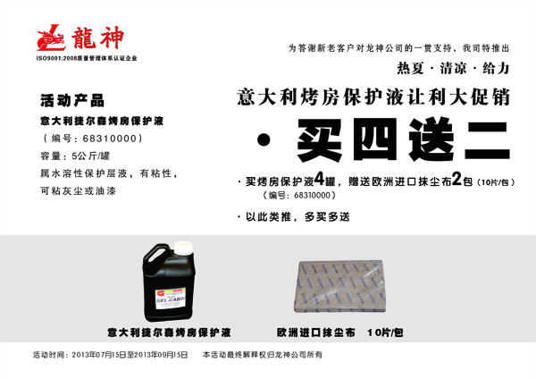 買烤房保護液4罐,贈送歐洲進口抺塵布2(10/)。如此類推,多買多送!