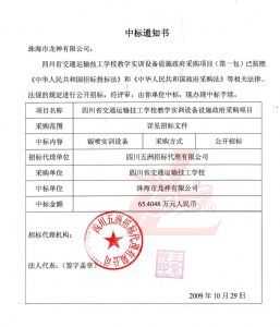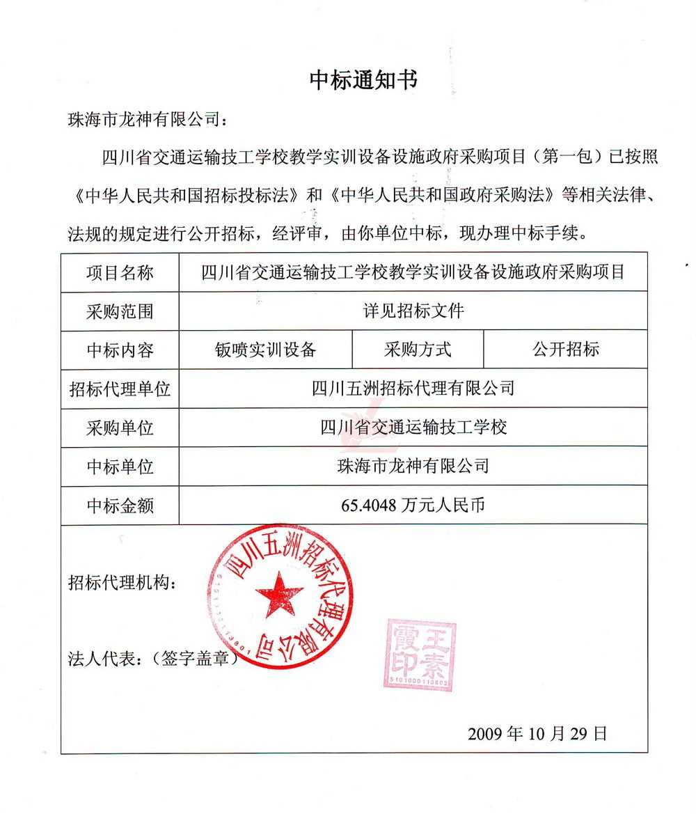 [喜訊]熱烈祝賀龍神成功中標-四川省交通運輸技工學校 [喜訊]熱烈祝賀龍神成功中得四川省交通運輸技工學校標 [新聞中心]珠海市龍神有限公司經過長時間的籌備已成功中得四川省交通運輸技工學校教學實訓設備設施政府采購項目標,這是珠海市龍神有限公司一種實力的表現。說明了珠海龍神的品牌在不斷的加強、深化。 珠海龍神公司一直專業、效率、服務、環保。同時“龍神”在創新中求發展,在發展中求創新的原則。 (中標通知書,點擊放大圖) 2009-11-06 9085