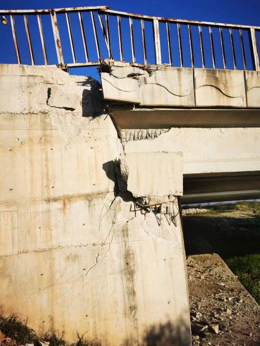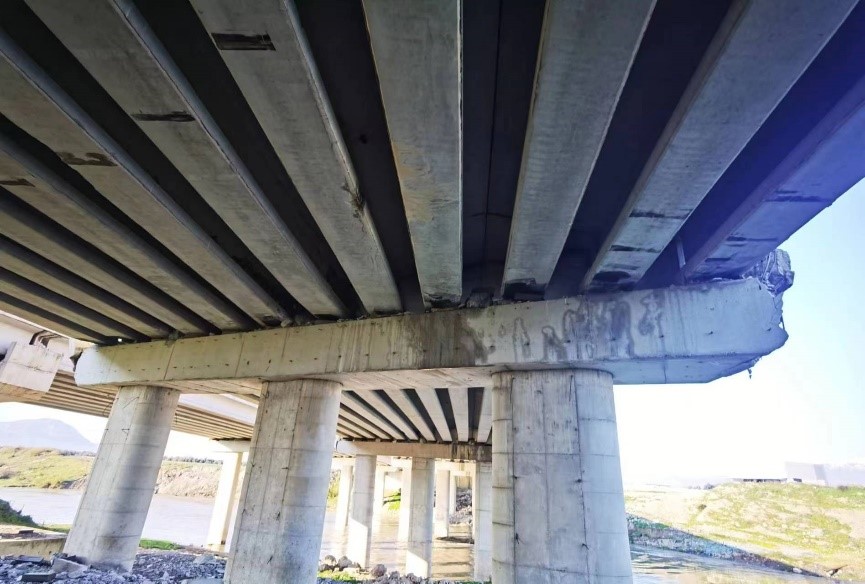 2月15日,對營地附近的一座橋梁進行了觀察(圖1)。該橋梁為一座雙向五跨雙墩簡支梁橋。地震發生時河岸兩地劇烈晃動,兩岸場地帶動橋臺相向運動,橋梁受擠壓整體向上抬起。