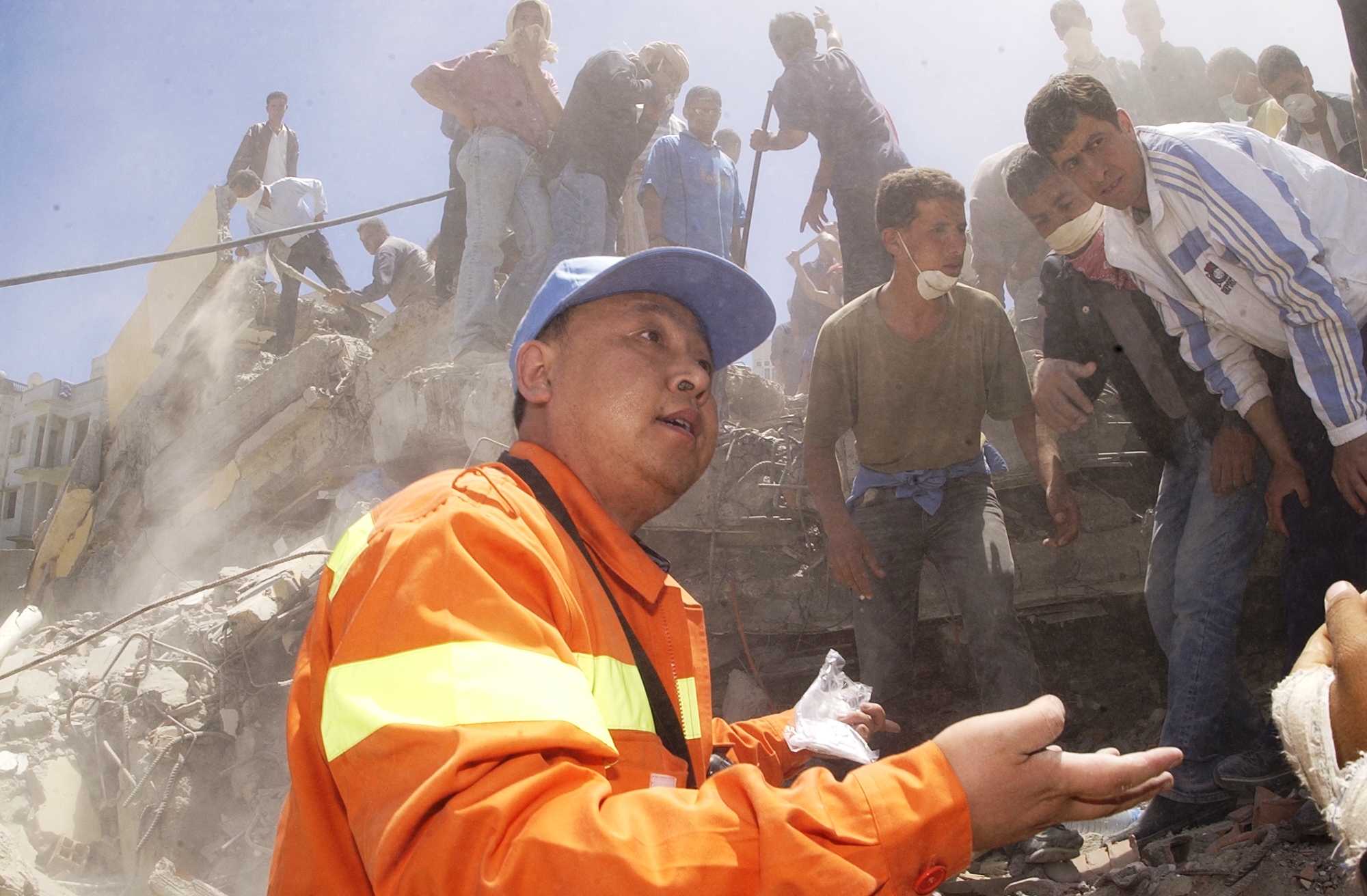 發布時間: 2023-08-02 點擊數量:5590走進位于哈爾濱市南崗區的中國地震局工程力學研究所(簡稱“工力所”),文化墻上的一幅照片格外引人注目:震后的斷壁殘垣間,深膚色卷頭發的救援人員圍住一位中國專家,他身穿橘黃色國際救援隊服,正全神貫注地講解著。這是工力所二級研究員、博士生導師孫柏濤,作為中國國際救援隊專家參與指導2003年阿爾及利亞地震現場救援的場景。