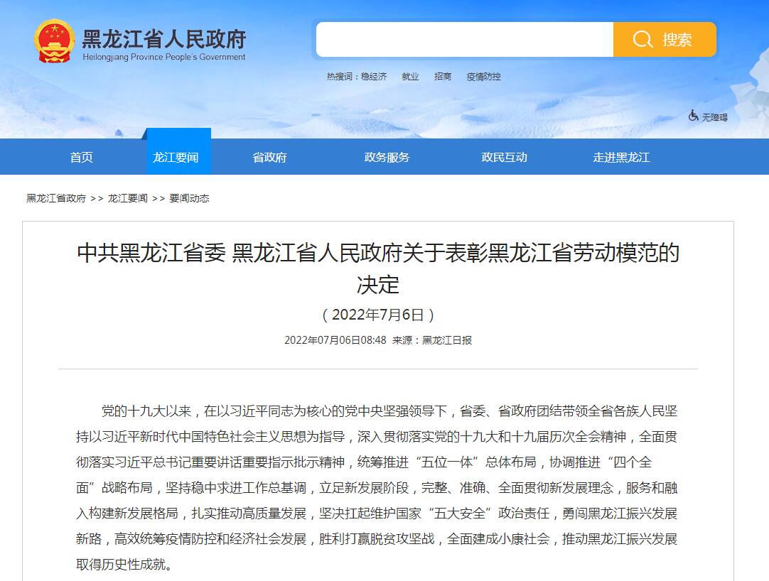 黑龍江省政府:中共黑龍江省委 黑龍江省人民政府關于表彰黑龍江省勞動模范的決定(2022年7月6日)