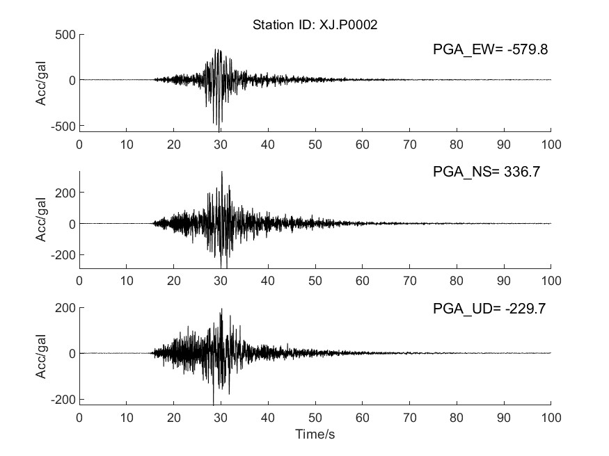 地震后工力所強(qiáng)震動(dòng)觀測中心共收取距震中100公里范圍內(nèi)實(shí)時(shí)強(qiáng)震儀記錄8組、烈度儀記錄18組,繪制了此次地震的儀器地震烈度(圖1)、峰值加速度(圖2)、峰值速度空間分布圖(圖3),以及典型記錄的時(shí)程曲線和反應(yīng)譜(圖4-7),供應(yīng)急參考。