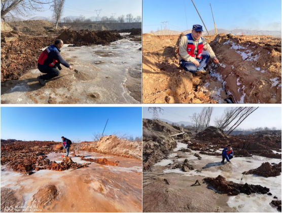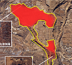 12月22日,在所領導的指示下,我所袁曉銘團隊成立了專門的液化調查組,組長為陳龍偉研究員,組員聶桂波研究員、王永志研究員、汪云龍副研究員、李兆焱副研究員和張昊宇副研究員。于12月23日早奔赴地震現場,重點考察中川鄉的震害問題。12月24日,調查組經過一天的艱苦調查,在此次地震流滑區上游發現了非常顯著液化現象(圖4),大規模液化分布在上游兩個區域內(圖5)。結合考察組掌握的以往震害經驗,判斷流滑區震害是上游發生大規模液化并導致長距離液化流滑所致,得出液化流滑是中川鄉震害誘因的結論,并向中國地震局甘肅積石山6.2級地震科考指揮部報告。