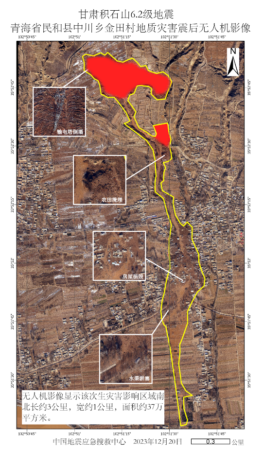 發布時間: 2023-12-25 點擊數量:69492023年12月18日23時59分,甘肅省臨夏積石山縣發生6.2級地震。此次地震已造成部分房屋損毀甚至倒塌,并由此造成人員傷亡。除房屋倒塌外,此次地震在青海省海東市民和縣中川鄉金田村和草灘村引發了被稱之為“砂涌”的特殊現象,區域內部分房屋被厚達數米的流滑土壤掩埋(圖1)。