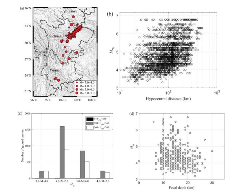 圖1 地震動數據分布 (a)地震的位置 (b)震源距和震級的關系
