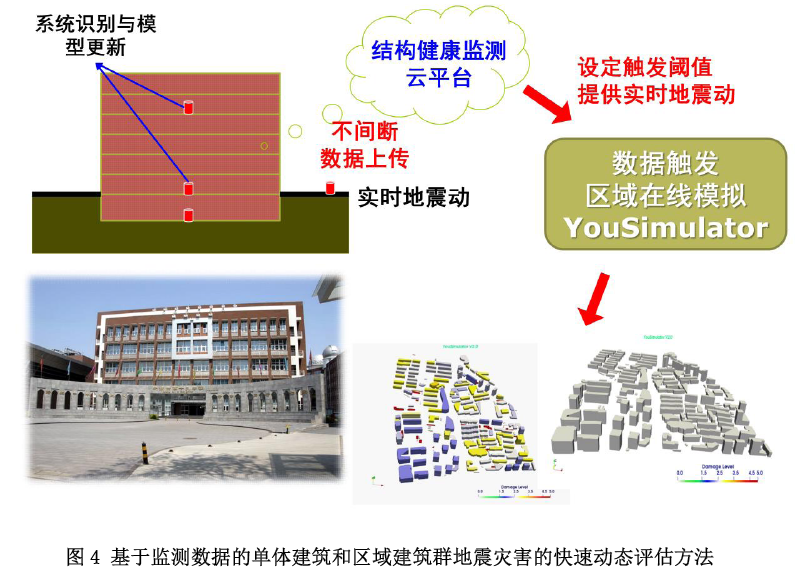 項(xiàng)目集成了新型傳感器、先進(jìn)的組網(wǎng)技術(shù)、秒級(jí)計(jì)算效率的基于監(jiān)測(cè)數(shù)據(jù)的單體建筑和區(qū)域建筑群地震災(zāi)害的快速動(dòng)態(tài)評(píng)估方法(圖4)等創(chuàng)新性成果,開發(fā)了“區(qū)域與城市地震監(jiān)測(cè)與風(fēng)險(xiǎn)動(dòng)態(tài)評(píng)估系統(tǒng)”(圖5),實(shí)現(xiàn)了基于監(jiān)測(cè)數(shù)據(jù)的公里網(wǎng)格級(jí)別的地震災(zāi)害風(fēng)險(xiǎn)快速動(dòng)態(tài)評(píng)估,提升了區(qū)域與城市地震災(zāi)害風(fēng)險(xiǎn)評(píng)估的時(shí)效性和精度。