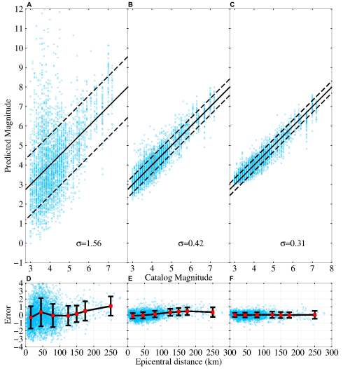 圖2 P波到達(dá)后3秒,(A,D)Tc方法、(B,E)Pd方法和(C,F)DCNN-M模型的震級估計(jì)