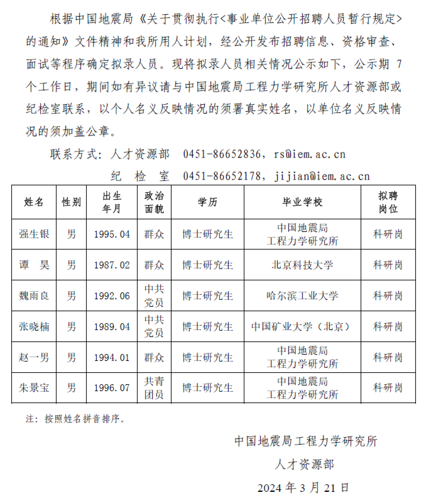 中國地震局工程力學(xué)研究所2024年擬錄用人員公示(二)