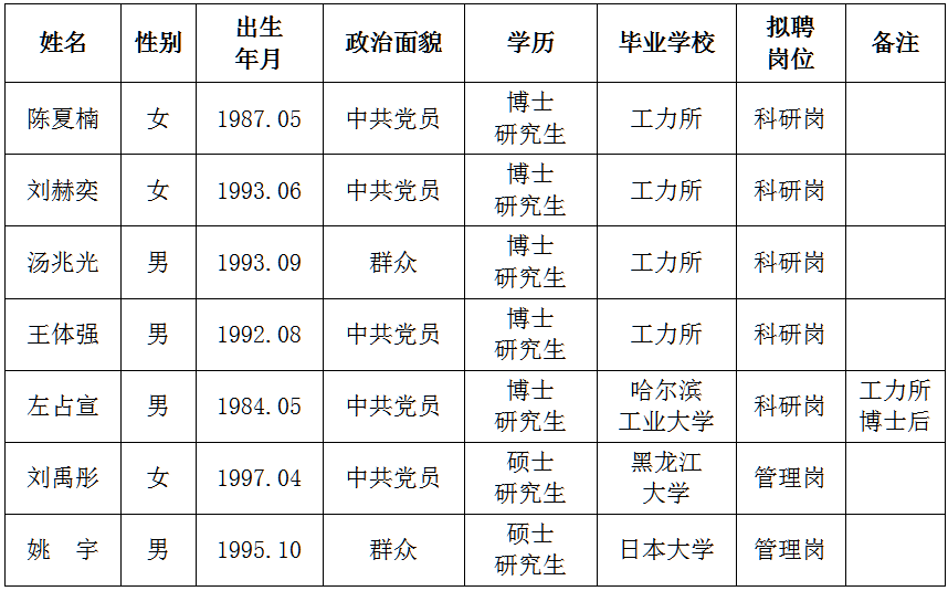 發布時間: 2022-05-30 點擊數量:9810根據中國地震局《關于貫徹執行〈事業單位公開招聘人員暫行規定〉的通知》文件精神和我所用人計劃,經公開發布招聘信息、資格審查、面試等程序確定擬錄人員。現將擬錄人員相關情況公示如下,公示期7天,期間如有異議請與中國地震局工程力學研究所人才資源部或紀檢室聯系,以個人名義反映情況的須署真實姓名,以單位名義反映情況的須加蓋公章。